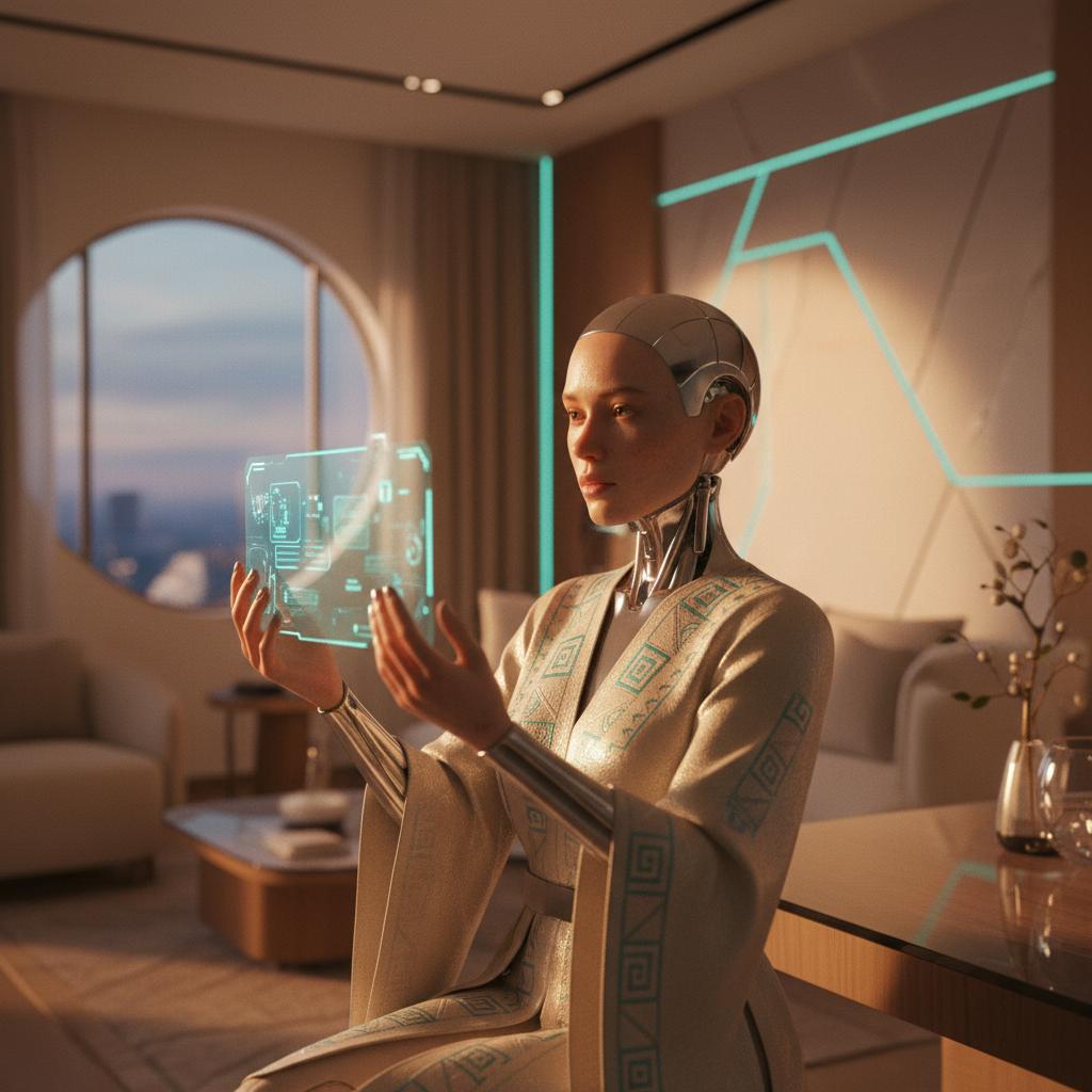 窗外的第一缕晨光穿透薄雾,照亮了房间里浮动的微尘。身边的它为你递上一杯精准控温的清水,手腕的屏幕上显示着一行柔和的文字:
